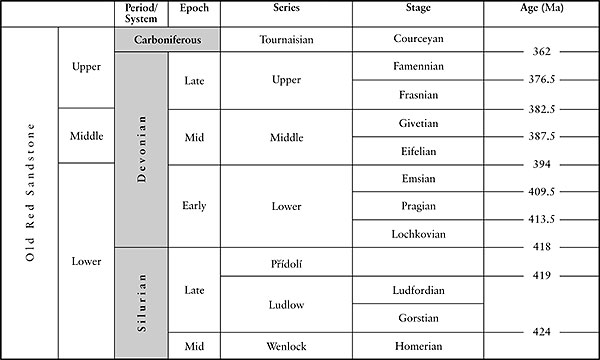 Caledonian Orogeny. Marine fossils are the main way used to correlate deposits of rock, but being mainly terrestrial, this is not possible in the ORS so instead, local stage names have been used within and between the basins (e.g. Downtonian and Dittonian).