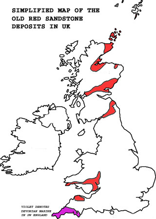 The Orcadian Basin (Orkney, NE Scotland and Shetland), the Midland Valley, the Scottish Border Basin, the Mell Fell Trough (Southern Lake District) and the Anglo-Welsh Basin. Best known are the MORS localities of the Orcadinan basin, where Miller and Dick once collected and which still yield world-class ichthyolites. Achanarras Quarry and Tynet Burn are favourites of the author but Rhynie (all be it fishless) is a truly fascinating environment. The sites of the Midland Valley are less known but tend to be LORS and Upper ORS, with little in the MORS. Turin Hill in the Midland Valley (LORS) is my absolute favourite site and the history of collecting there, starting with James Powrie, is just as interesting as any of that age. To the best of my knowledge there are no exposures containing articulated fossil fish in the Scottish Borders Basin. The famous sites of the Welsh Border Basin tend to be LORS and Upper Silurian and Lower Devonian in age. The exceptional material tends to ge found in lenses and the famous sites of Devils Hole, Heol Senni Quarry, Cwm Mill and Ledbury Cutting have produced some exceptional articulated fish. Rocks were also being laid down in the SW of England during this period, (hence the name Devonian) although being of marine origin were not included in the Old Red Sandstone (see violet are above)